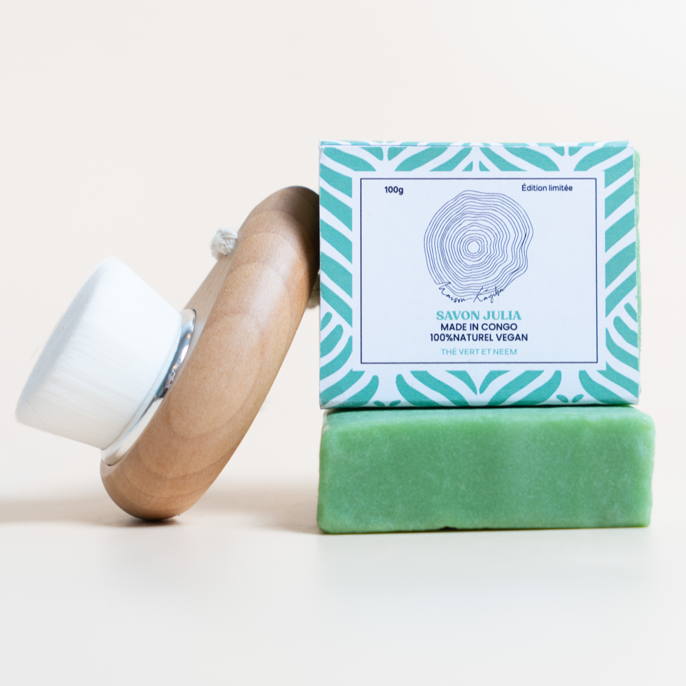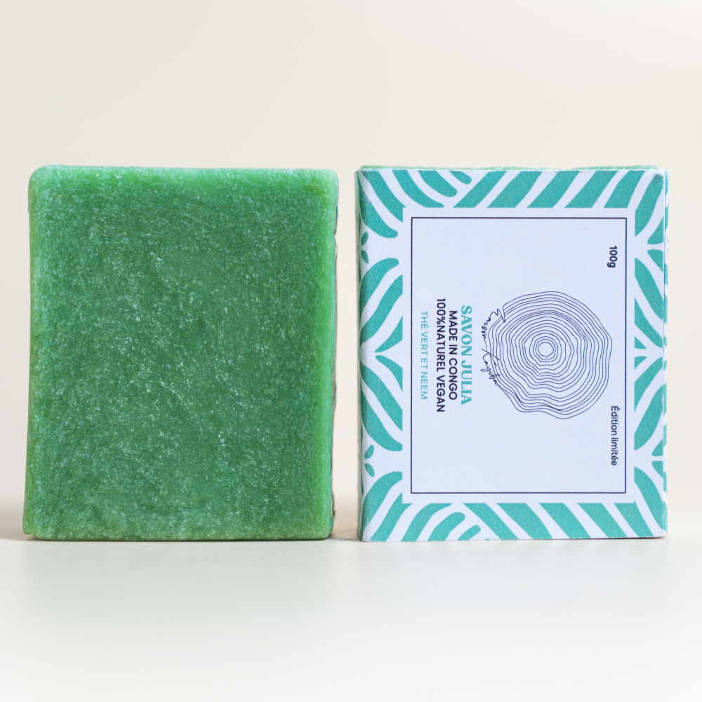 Le Savon Julia est un savon au thé vert et au neem, inspiré par ma mère, Julie Theys Tshiongo. À Kinshasa, elle est affectueusement surnommée « Julia Bella » ou Tshiboku, un nom qui fait référence à l’hippopotame, un animal à la personnalité forte et protectrice. Forte de son caractère et de sa détermination, ma mère ne se laisse jamais faire. C’est dans cet esprit que nous avons conçu un savon au neem et au thé vert au caractère affirmé, particulièrement efficace pour traiter les problèmes de peau, notamment l’acné et les boutons.